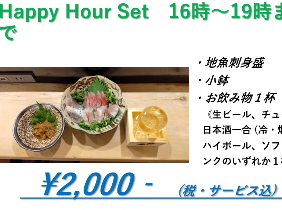 月、火、水、木 16時から19時限定でハッピーアワーセットを始めました。新鮮な地魚をご賞味ください。